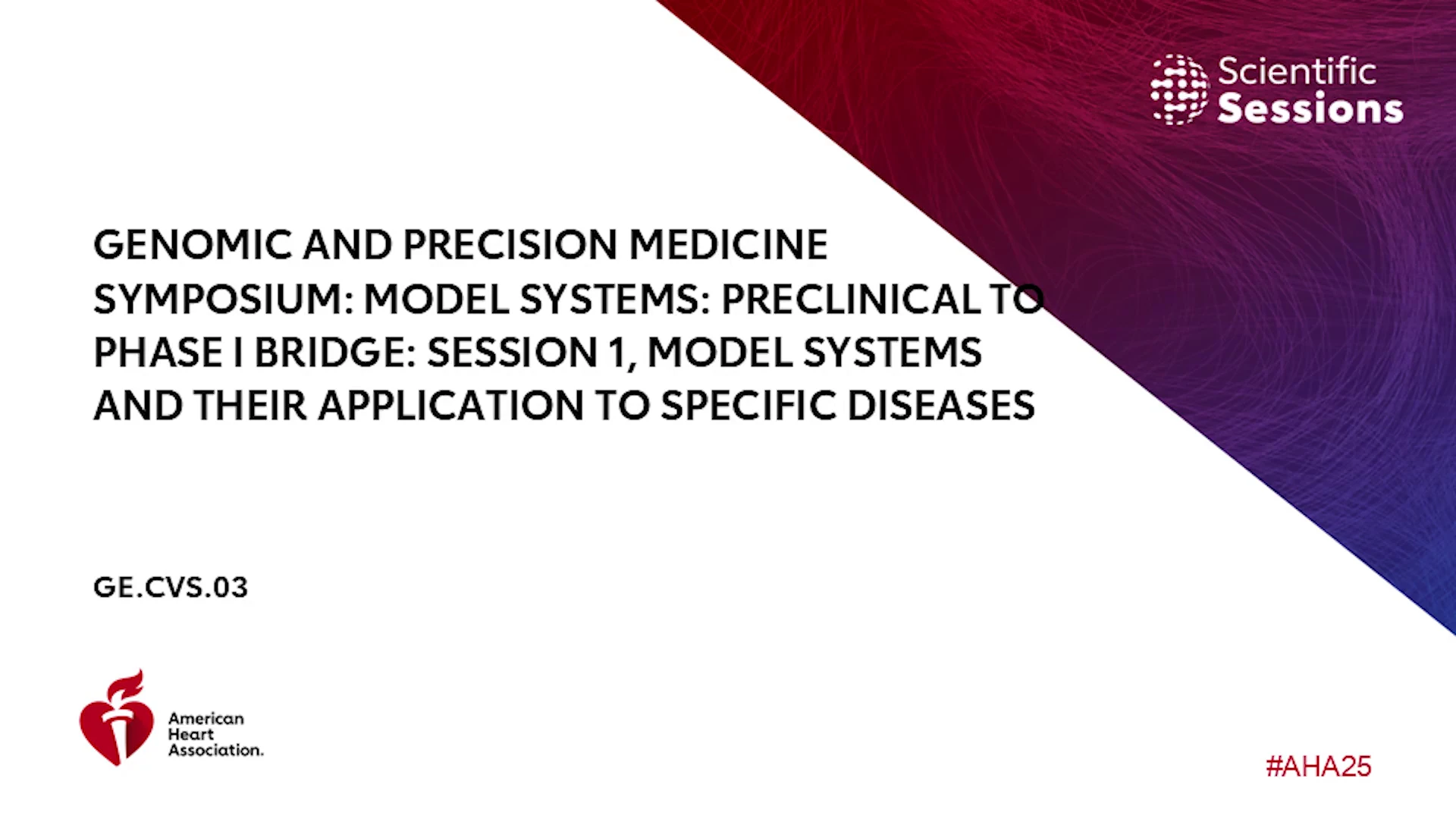 Genomic and Precision Medicine Symposium: Model systems: Preclinical to Phase I Bridge: Session 1, Model Systems and their Application to Specific Diseases - AHA OnDemand Skip to main content